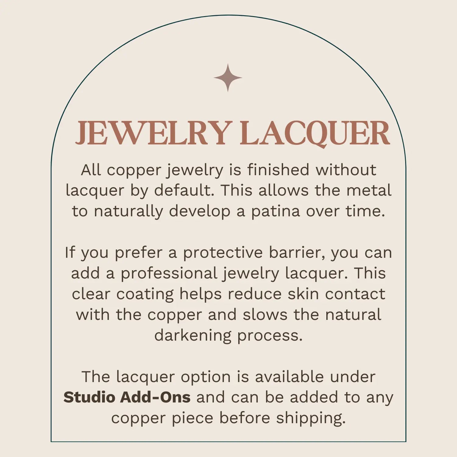 Preserve the beauty of your copper jewelry with our professional-grade lacquer upgrade. ✨ This invisible seal is applied by hand in the studio and offers a layer of comfort and protection without taking away from the natural beauty of your piece.